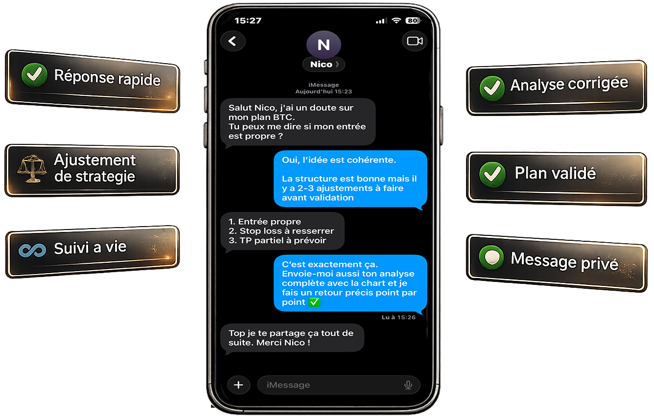 à un moment clé de ton parcours, on fait un point en individuel pour aligner ta méthode à TON profil et éviter les erreurs qui coûtent cher (surtrade, levier, plan flou, risk mal calibré).